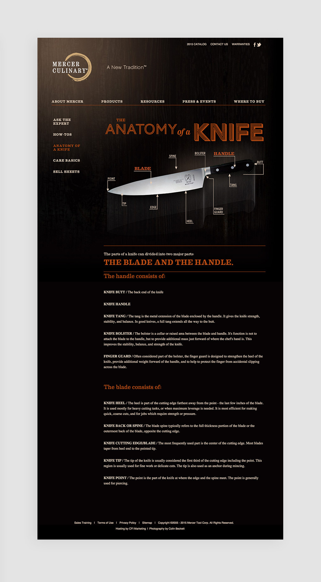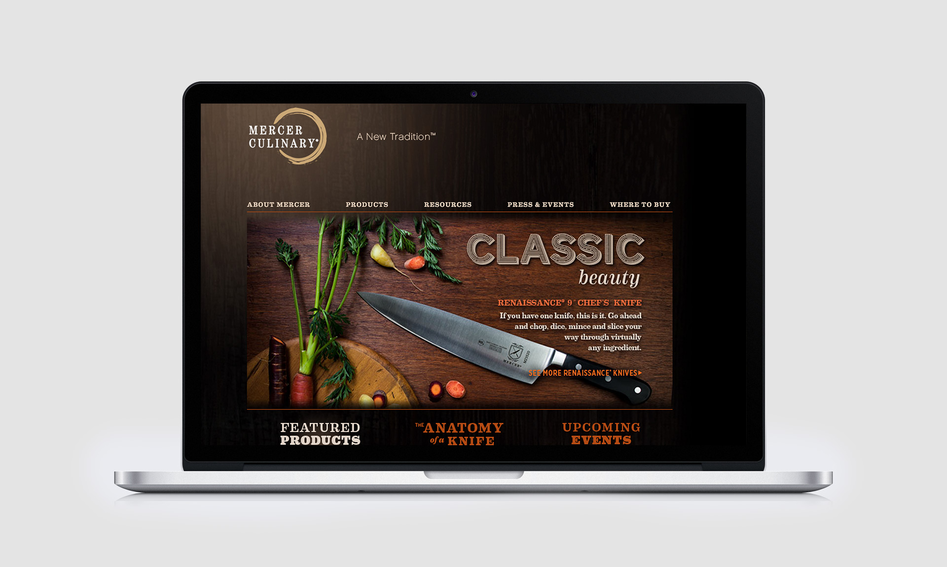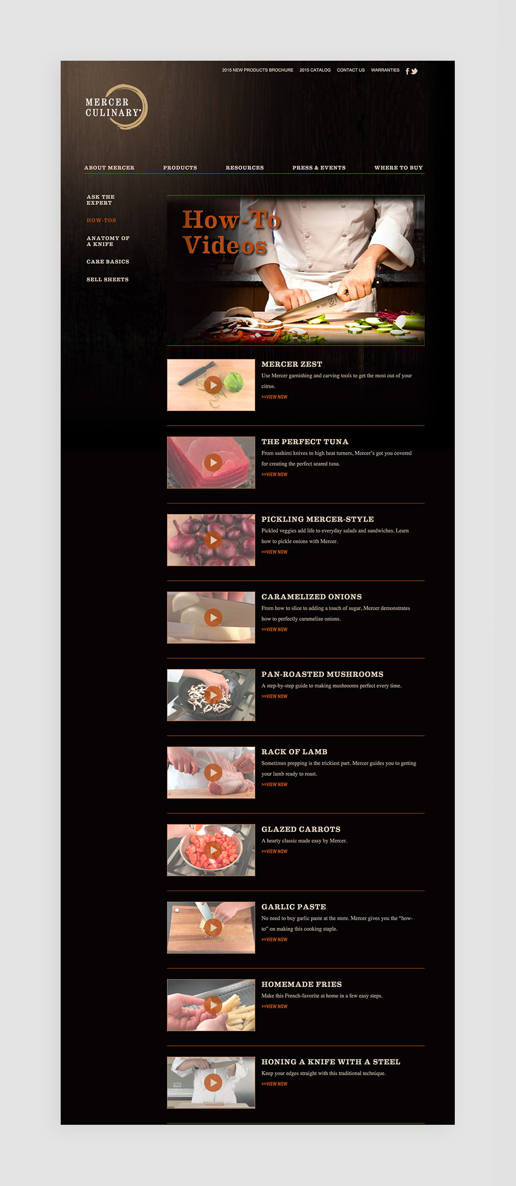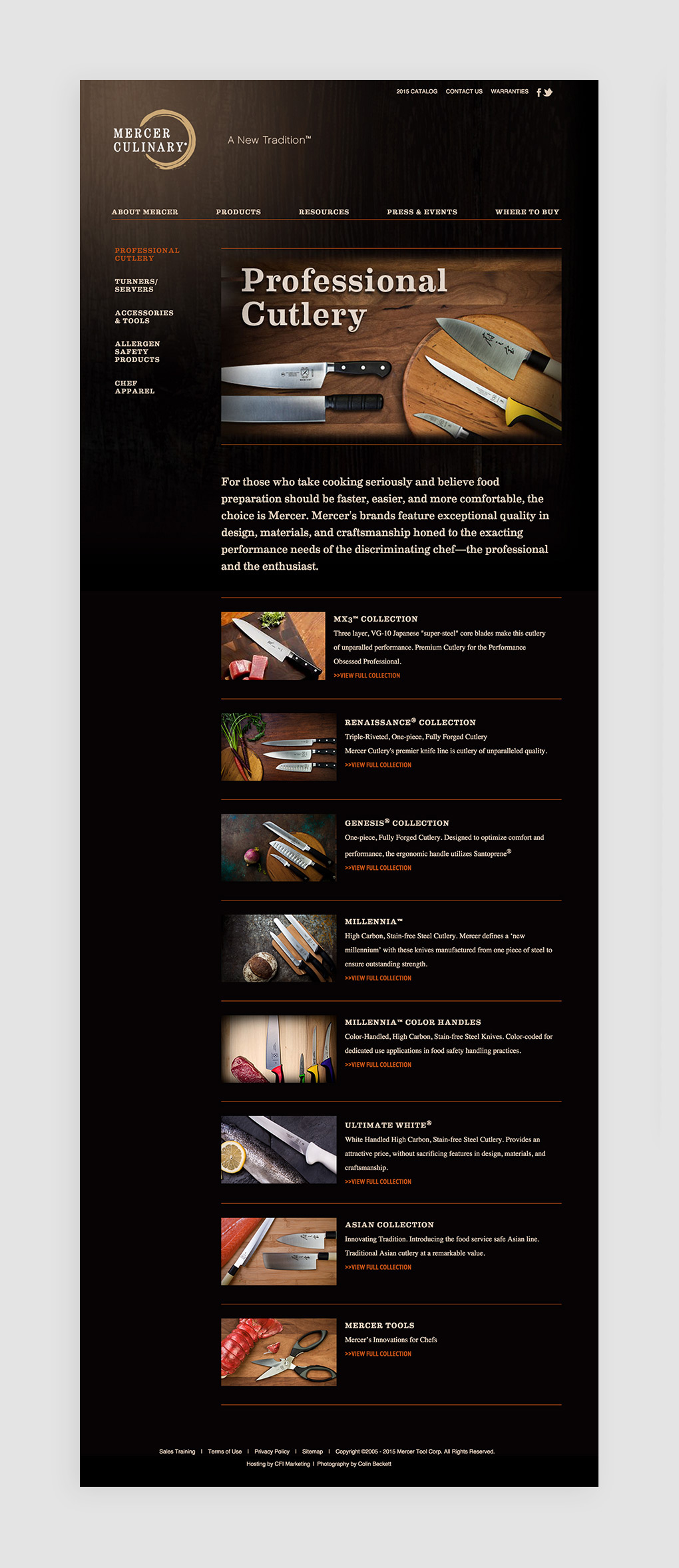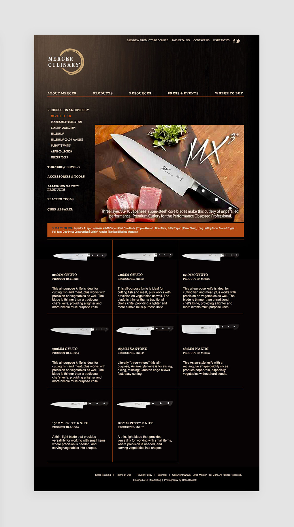 Mercer Cutlery—a high-end knife and kitchen tool brand—wanted a new website that better targeted professional and aspiring chefs. I developed the site on the Drupal CMS to showcase their product catalog with added features of hover animations and how-to videos.